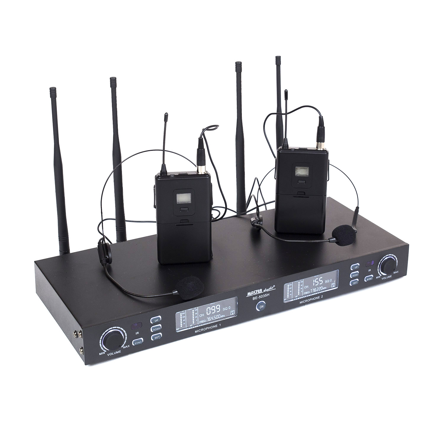 Wireless UHF dual channel system, with two head set transmitters with LCD display.