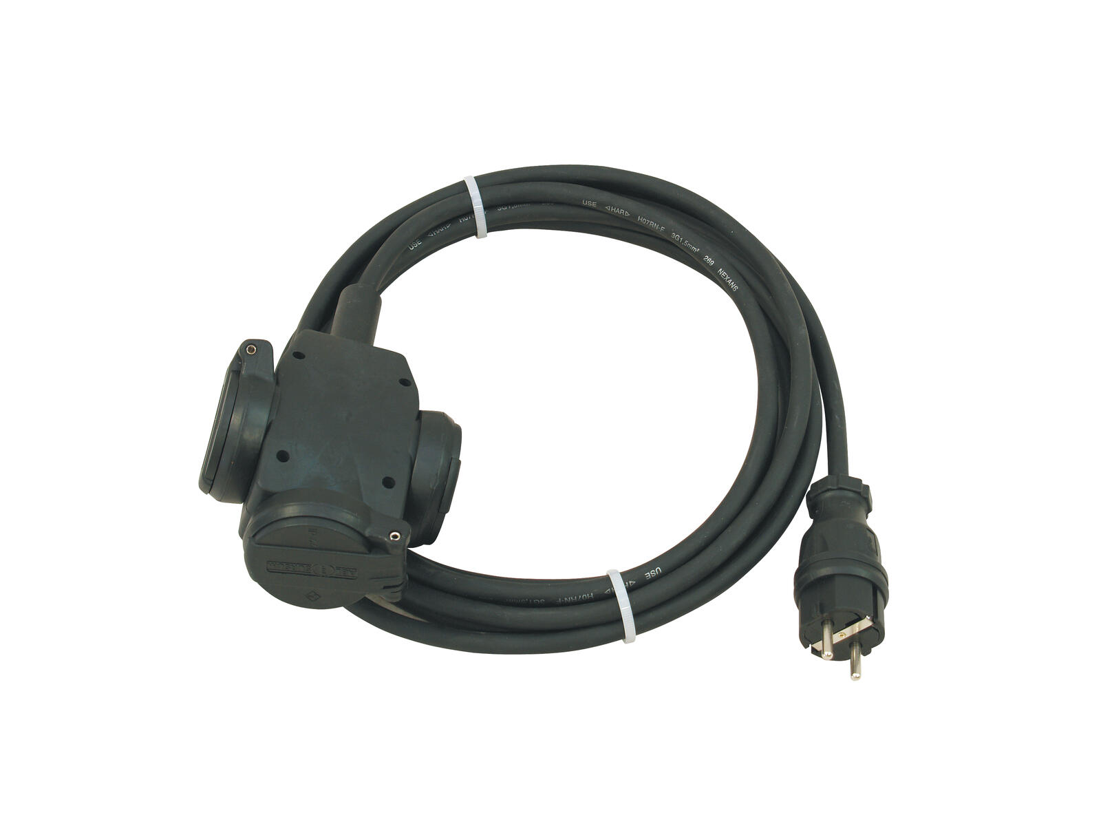 - Schwere Gummischlauchleitung mit anmontiertem Schutzkontakt-Gummistecker Vollgummi-Dreiwegekupplung
