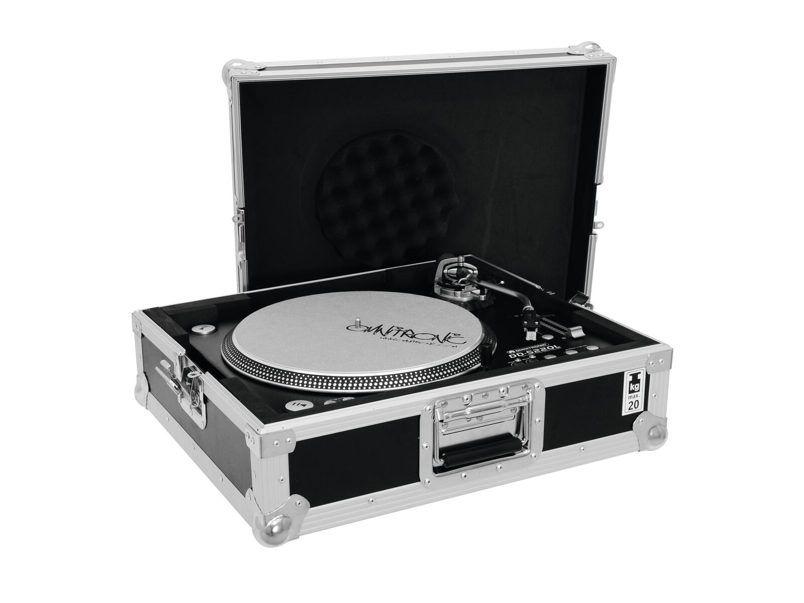 Flightcase für einen Plattenspieler bis 450 mm BreiteDas schaumstoffgepolsterte Roadinger Flightcase bietet Ihnen Platz für einen Plattenspieler ohne Abdeckung bis zu einer Breite von 450 mm Breite. Die hochwertige Verarbeitung durch mehrschichtig verleimtes Holz und die vier stahlverstärkten Gummifüße sorgen für eine gute Stabilität des Roadinger Plattenspieler-Cases. Zusätzlich verfügt das Flightcase über zwei abschließbare Butterfly-Schlösser - so ist Ihr Plattenspieler immer sicher verstaut. Die maximale Last beträgt 20 kg.
