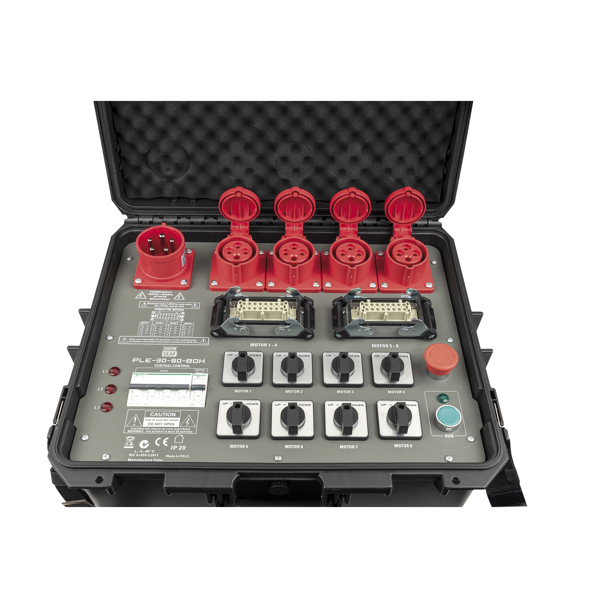 Die Showgear-Kettenzug-Steuerung ist eine spezielle Steuerung für alle gängigen direkt gesteuerten Kettenzüge wie CM Lodestar. Jeder der 8 Kettenzüge kann individuell ausgewählt werden, um nach oben oder unten zu fahren oder abgewählt zu werden. Er verfügt über 4 x 4-polige CEE-Stecker sowie 2 Stück 16-polige Multipin-Stecker zum Anschluss einer Break/Out-Box.