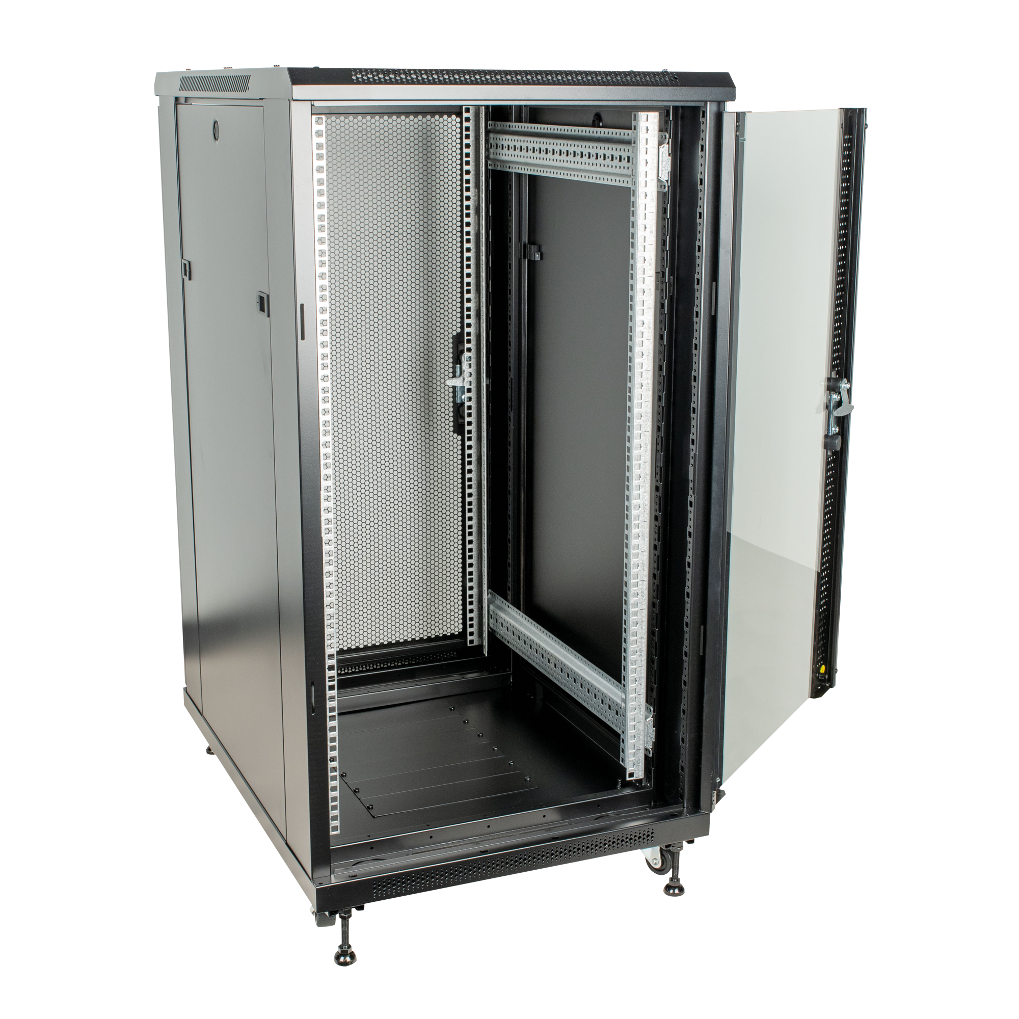 Der Showgear RCA-FSG-22 ist ein abschließbarer 19" Netzwerkschrank mit einer Höhe von 22 Rackeinheiten (978 mm). Er ist sowohl mit Schwenkrädern als auch mit Gummifüßen ausgestattet. Sie können zwischen beiden Optionen wählen, so dass er sowohl für mobile als auch für feste Anwendungen geeignet ist. Dieser Netzwerkschrank kann an jeder Seite geöffnet werden, da er über zwei abnehmbare Seitenwände, eine Gittertür auf der Rückseite und eine Glastür auf der Vorderseite verfügt. Das macht es einfach, 19-Zoll Rackware zu installieren und zu aktualisieren.