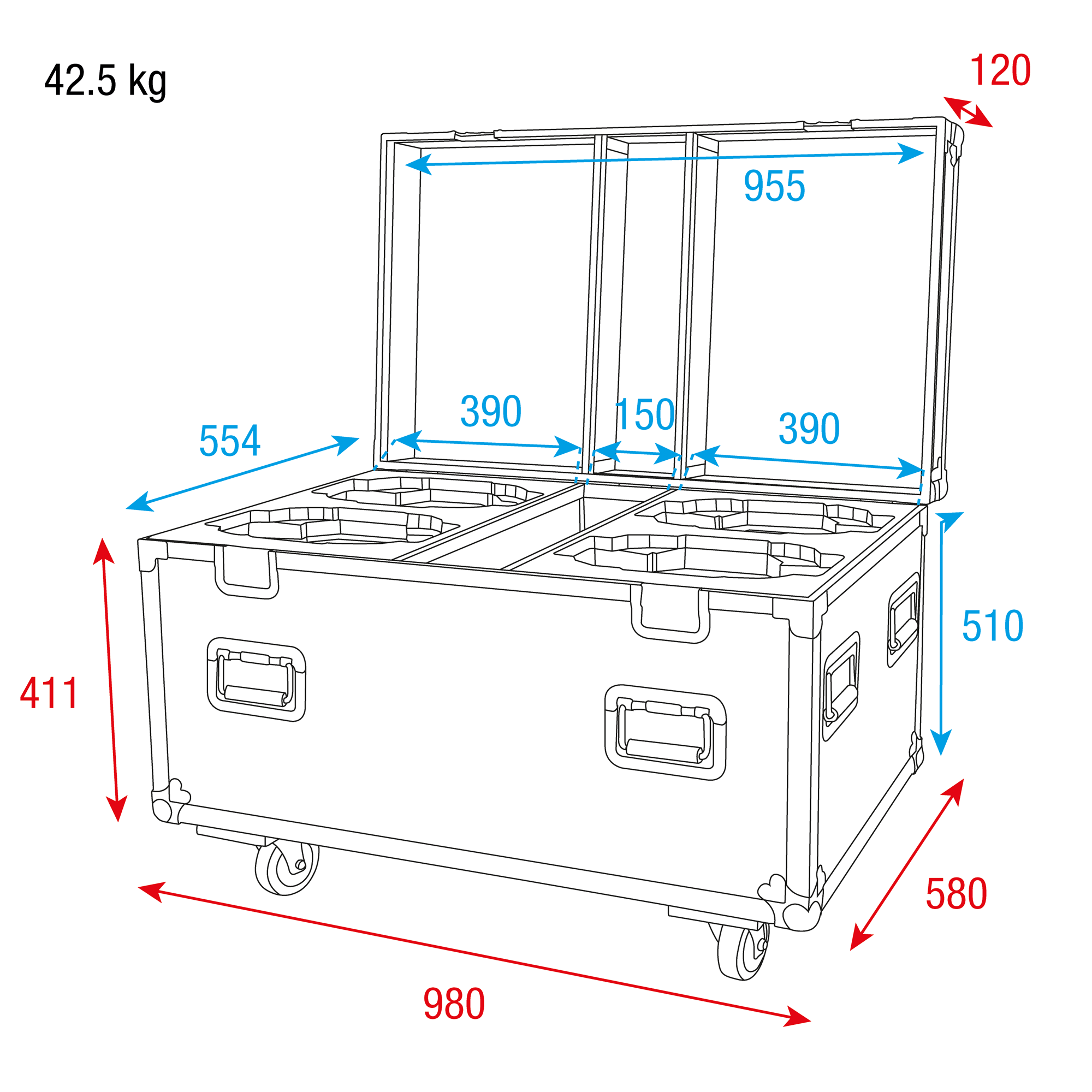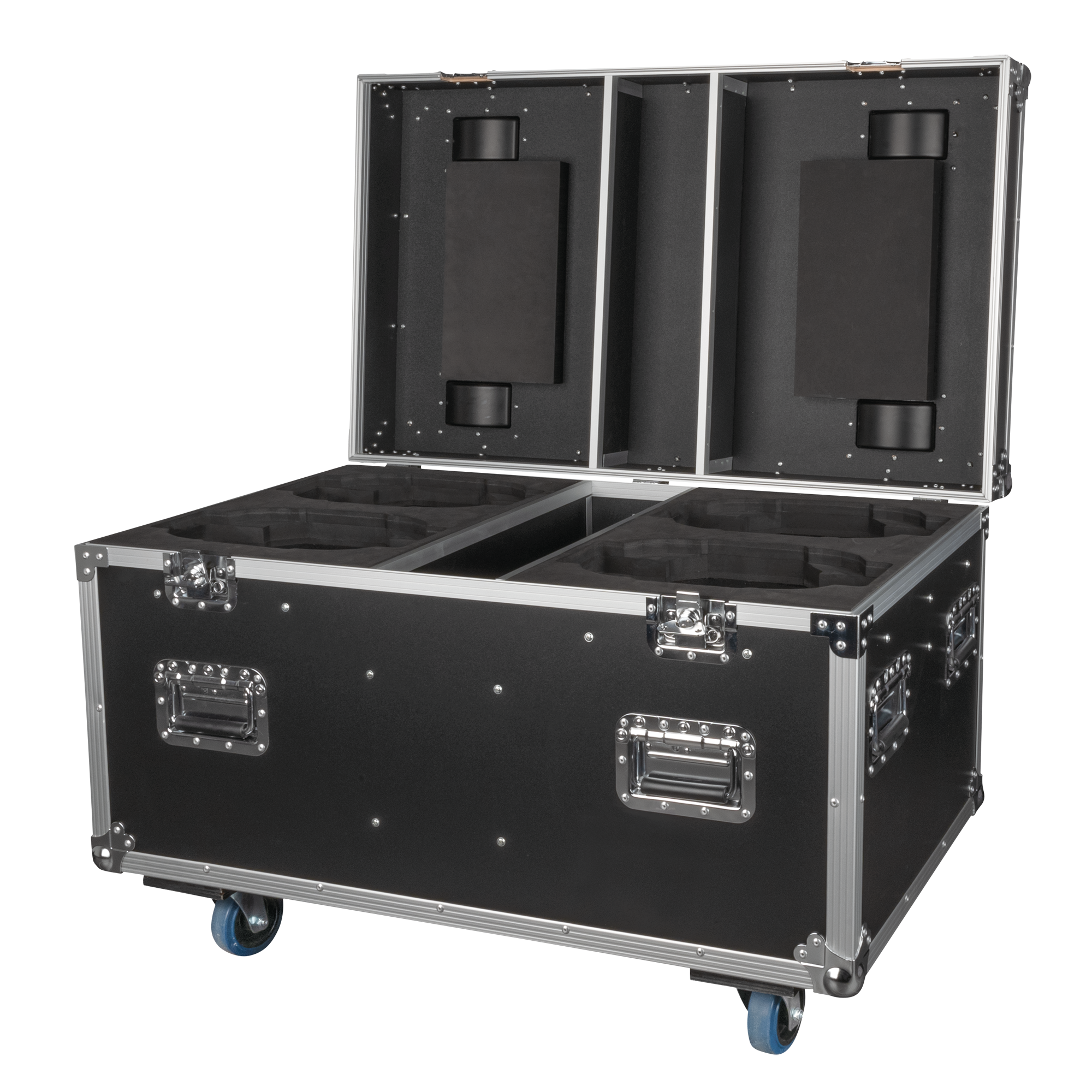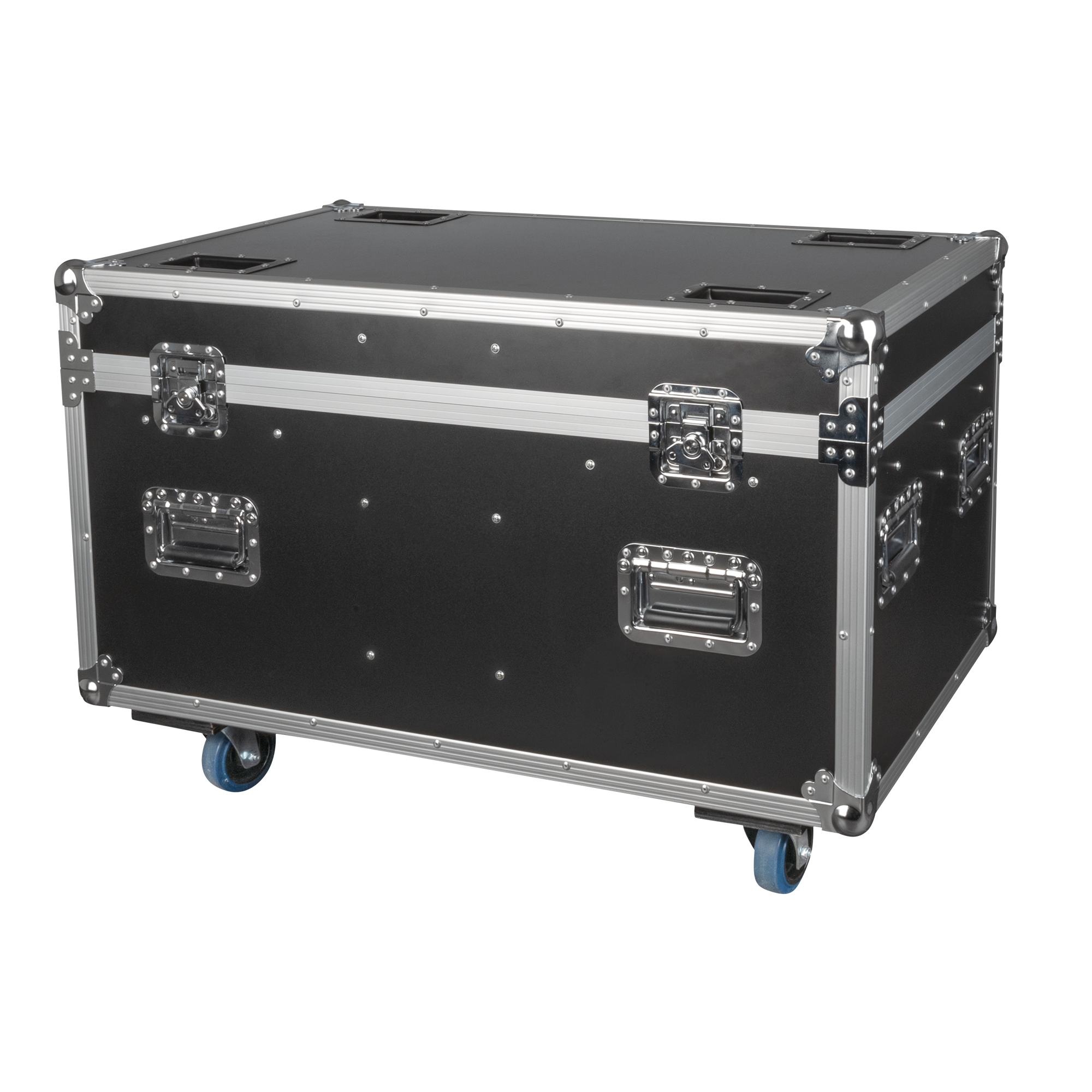 Das Case ist aus strapazierfähigem 9 mm starkem Sperrholz gefertigt und verfügt über eingelassene Griffe an strategischen Stellen für eine einfache Handhabung und Schmetterlingsverschlüsse, um den Deckel geschlossen zu halten. Der Koffer ist mit 4 Schwenkrädern (2 davon mit Bremsen) ausgestattet, die eine einfache Manövrierbarkeit ermöglichen. Durch die Stapelschalen im Deckel können mehrere Cases sicher gestapelt werden, ohne dass sie sich bewegen.