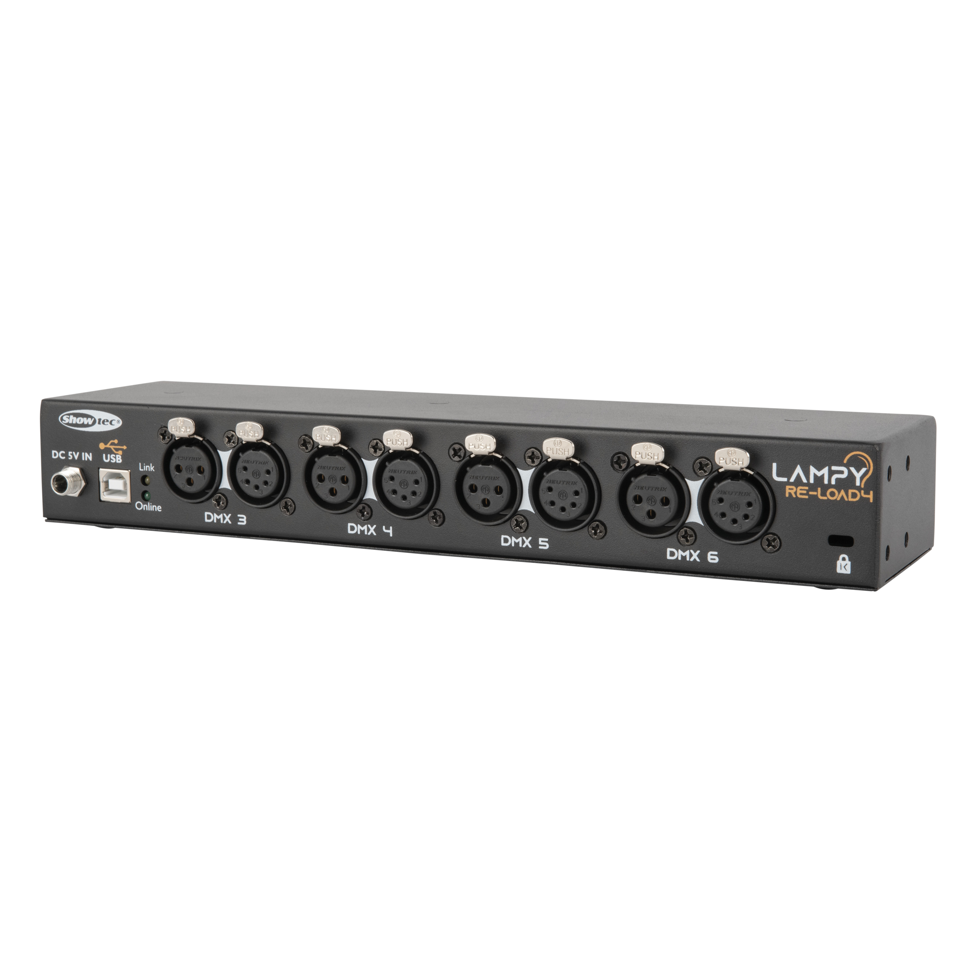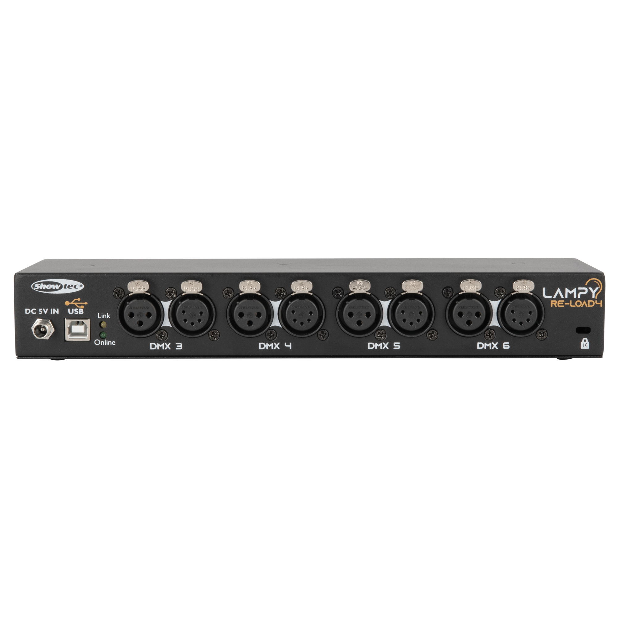 Das LAMPY Re-Load 4 ist ein Plug-and-Play Erweiterungsset, das vier zusätzliche Universen auf einer LAMPY Konsole freischaltet. Wenn Sie Geräte mit vielen DMX-Kanälen oder einfach nur viele Geräte verwenden, haben Sie mitunter zu wenig Kanäle auf Ihrem LAMPY oder brauchen ein weiteres DMX-Universum (oder noch mehr). Das Re-Load 4 ist die ideale Lösung für dafür, denn es bietet vier zusätzliche Universen (insgesamt 2048 zusätzliche Kanäle)! Es verfügt über 3- und 5-polige Ausgangsanschlüsse für jedes der vier zusätzlichen Universen. Die Montagebügel ermöglichen eine einfache Installation in einem 19"-Rack oder Flightcase. Der Netzeingang ist mit einem verriegelbaren DC-Stecker und einer 5-Volt-Stromversorgung ausgestattet.