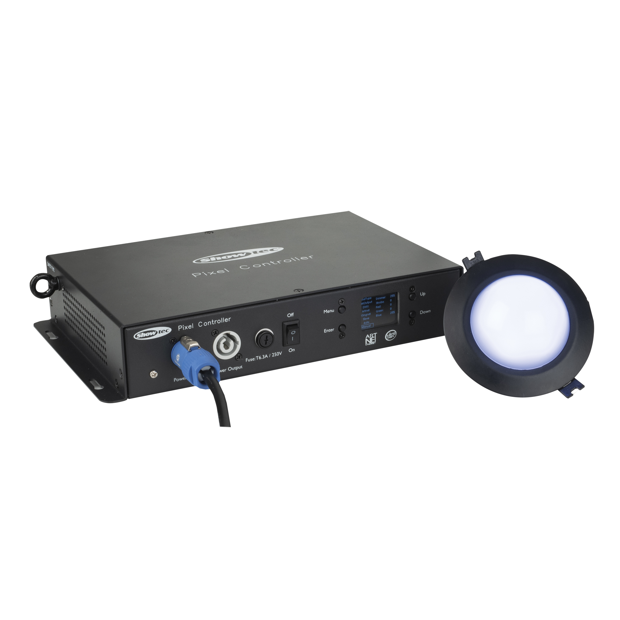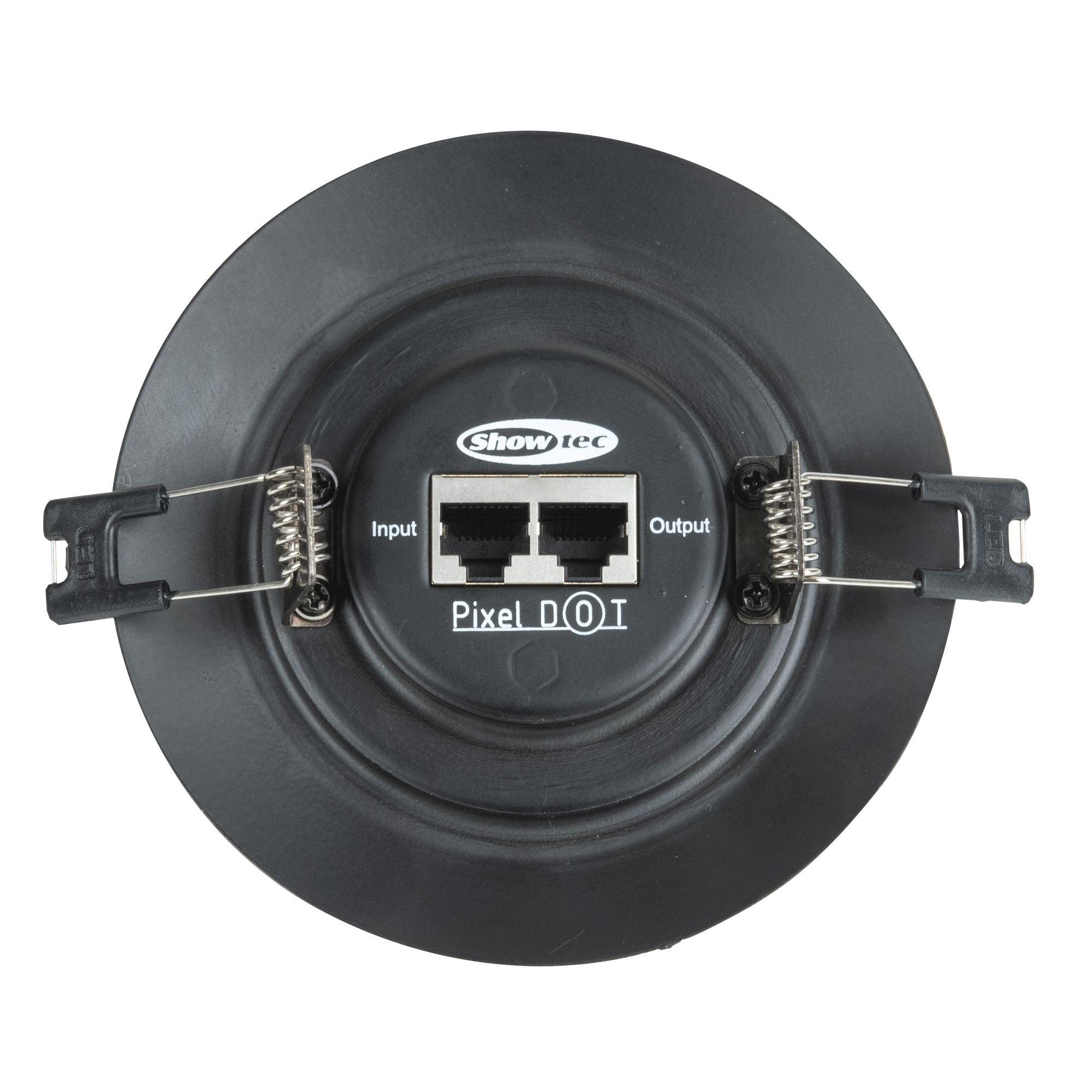 Der Showtec PixelDot ist ein anreihbarer RGB-LED-Punkt mit schwarzem Gehäuse und einer weiß gefrosteten 50 mm Abdeckung, geeignet für Farbmischungen bei festen installationen. Angesteuert durch den dedizierten Pixelkontroller, kann der PixelDot mit einem einzigen Cat-Kabel bis zu 40 Einheiten pro Pixelkontroller-Ausgang und bis zu 160 Pixeldots pro Pixelcontroller in beliebiger Weise in Reihe geschaltet werden. Ausgestattet mit Federklemmen ist die Installation der PixelDots genauso einfach wie bei herkömmlichen Einbaustrahlern. Ein 50 cm langes RJ45-Kabel ist im Lieferumfang enthalten.