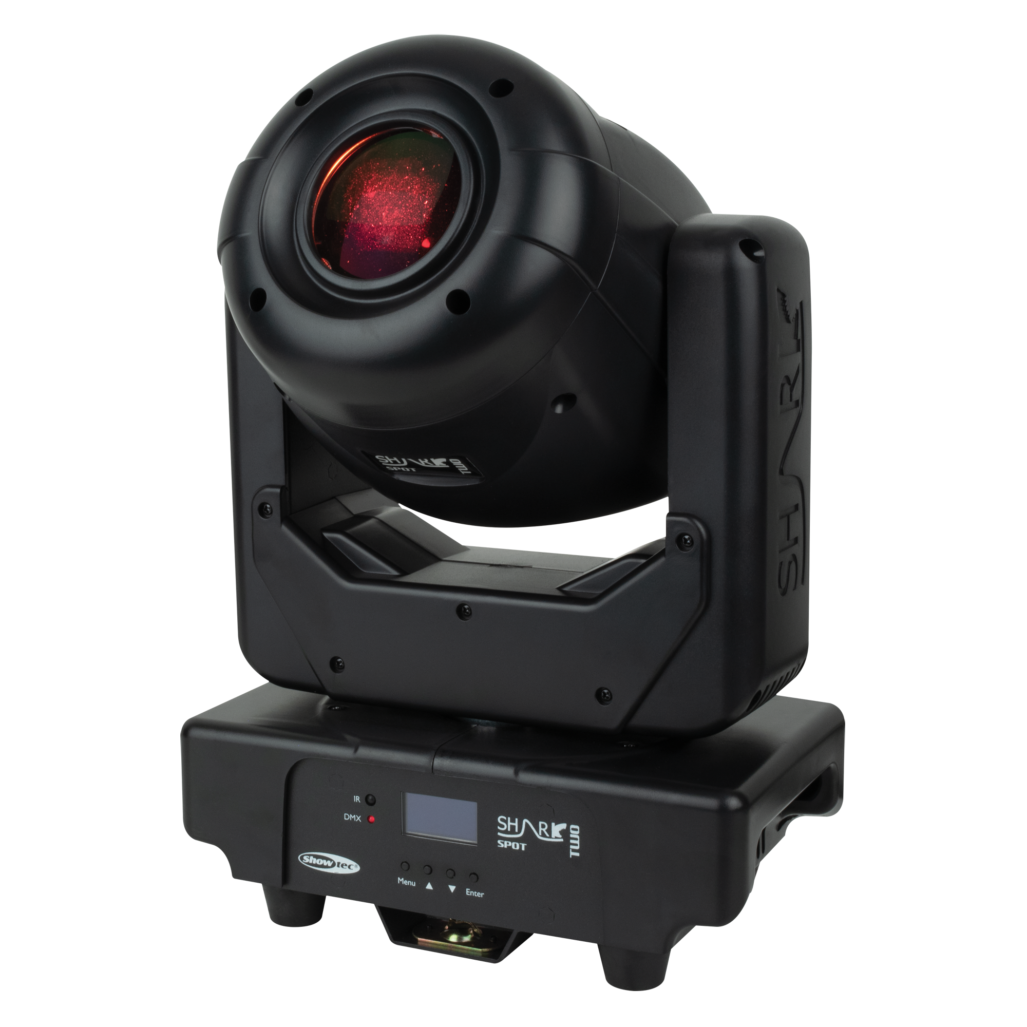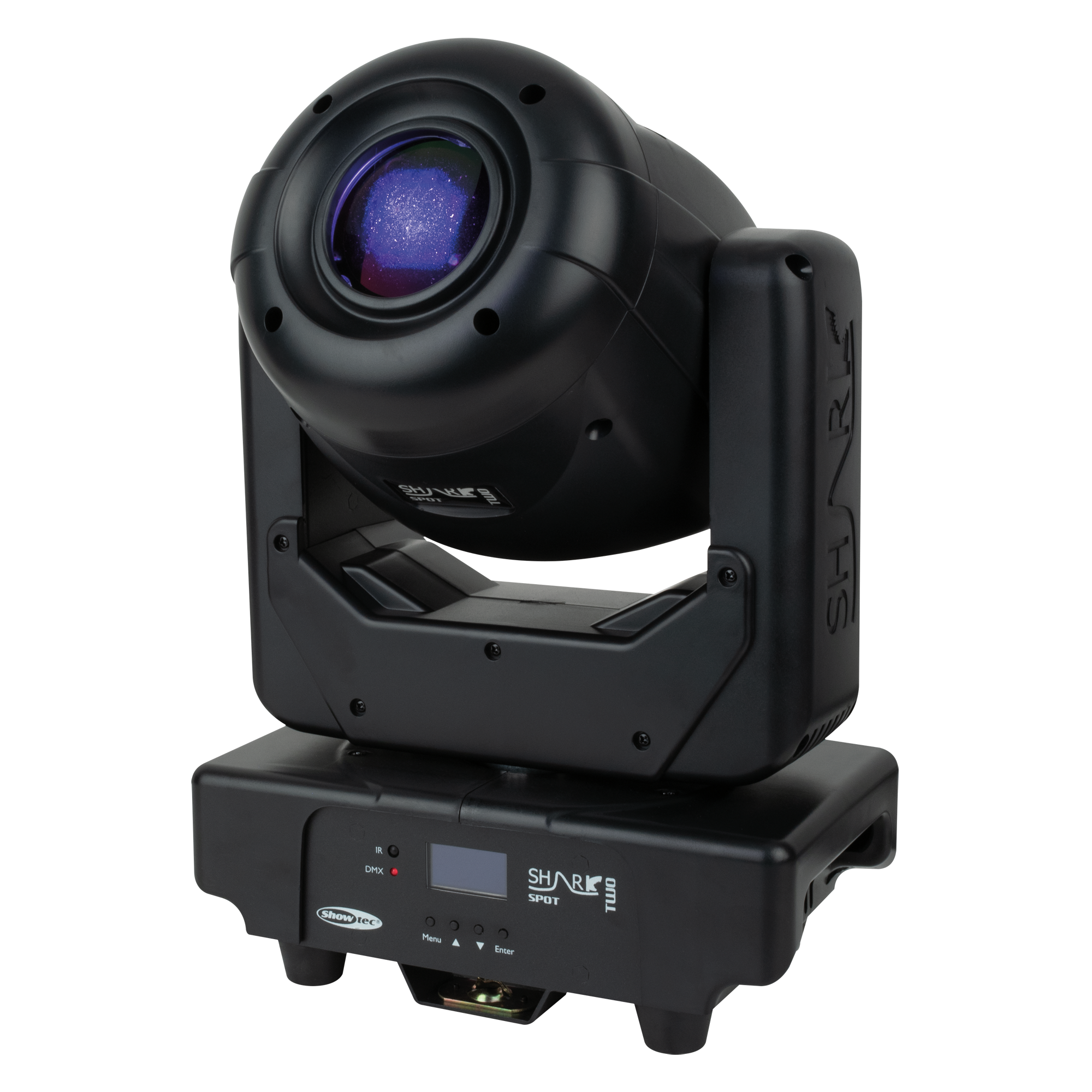 Der Showtec Shark Spot Two ist ein LED-Moving-Head mit einer Leistung von 90 Watt für die Verwendung im Innenbereich. Er ist 50 Prozent leistungsstärker als der Shark Spot One und verfügt über sieben dichroitische Farben plus offen und ein dreifaches Prisma. Damit hat er alles, was es für eine farbenfrohe und dynamische Lichtshow braucht. Mit seinen sechs Gobos können Sie beeindruckende Effekte erstellen, während der motorisierte Fokus dafür sorgt, dass alles messerscharf dargestellt wird. Selbstverständlich verfügt er auch über eine Dimmer- und eine Stroboskopfunktion. Der Shark Spot Two kann im DMX-, Auto- oder musikgetakteten Modus laufen, als Master- oder Slavegerät dienen und mit der mitgelieferten Fernbedienung gesteuert werden. Sie können die Einstellungen direkt über das integrierte OLED-Display ändern.