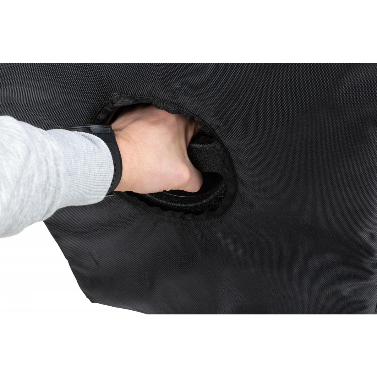 Transportschutzhülle für SA-B15 von SYNQ Diese Transportschutzhülle ist aus superstarkem schwarzem 1680D-Polyester gefertigt. Ausgestattet mit einer wasserabweisenden TPU-Beschichtung. Die 10 mm dicke Polyethylen-Schaumstoffpolsterung schützt den Lautsprecher optimal beim Transport. Verfügt über ein Staufach für das Netzkabel. Passgenau mit Aussparungen für die Griffe.