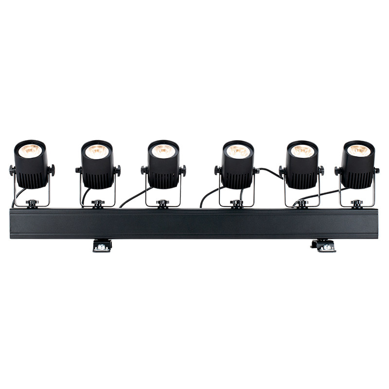 The Saber Bar 6 is a 6-head pinspot lighting system mounted on a 1-meter linear base with built-in power and DMX connections. Each pinspot is similar to the Saber Spot WW with a 15W Warm White LED (3100K) and an ACL lens that produces a razor sharp 4-degree beam. Each fixture’s X/Y axis may be individually adjusted manually for precision angling of the beams. There are two heavy duty adjustable brackets to mount the fixture to a ceiling or truss.