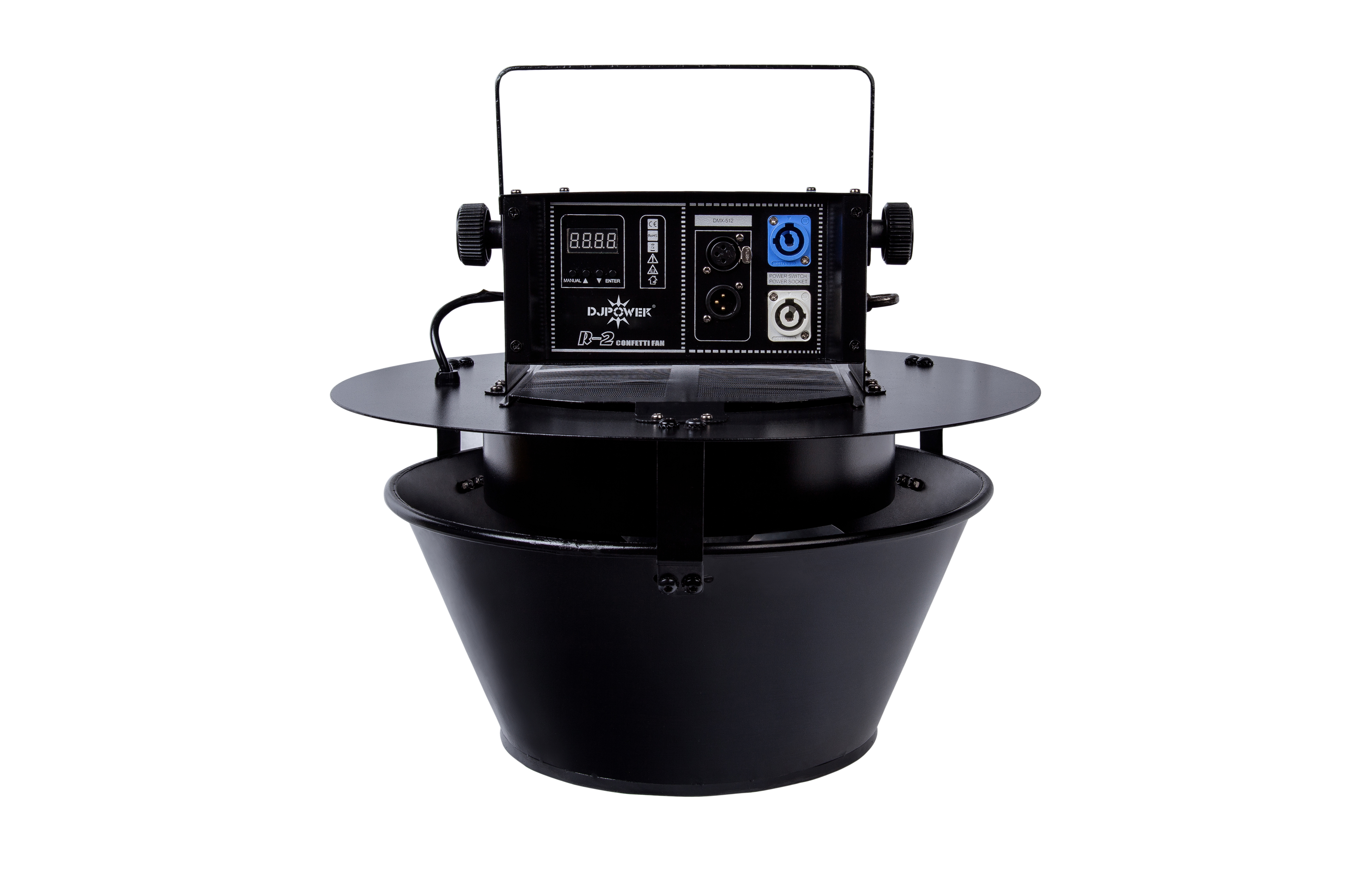 R-2 is a floating confetti machine, suitable for hanging, multiple sets can be used daisy chained via DMX. Good quality fan as power to blow confetti. R-2 can produce massive slow-falling confetti, bringing festivity to the ceremony and performance. White paper will create snowflake effect, suitable for movie and TV drama. Once UV lamp opened in the dark, fluorescent green paper will create dazzling effect. With an installation height of 10 meters, the confetti can be distributed by the machine in a radius of up to max. 80m², depending on the confetti size and room conditions. Hanging higher would improve the effect.