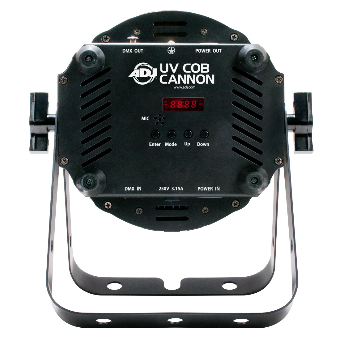 The ADJ UV COB Cannon produces a large ultraviolet wash from high output, advanced COB (Chip On Board) UV LEDs–COB LED technology allowing for a powerful LED engine to be placed in a small amount of space.