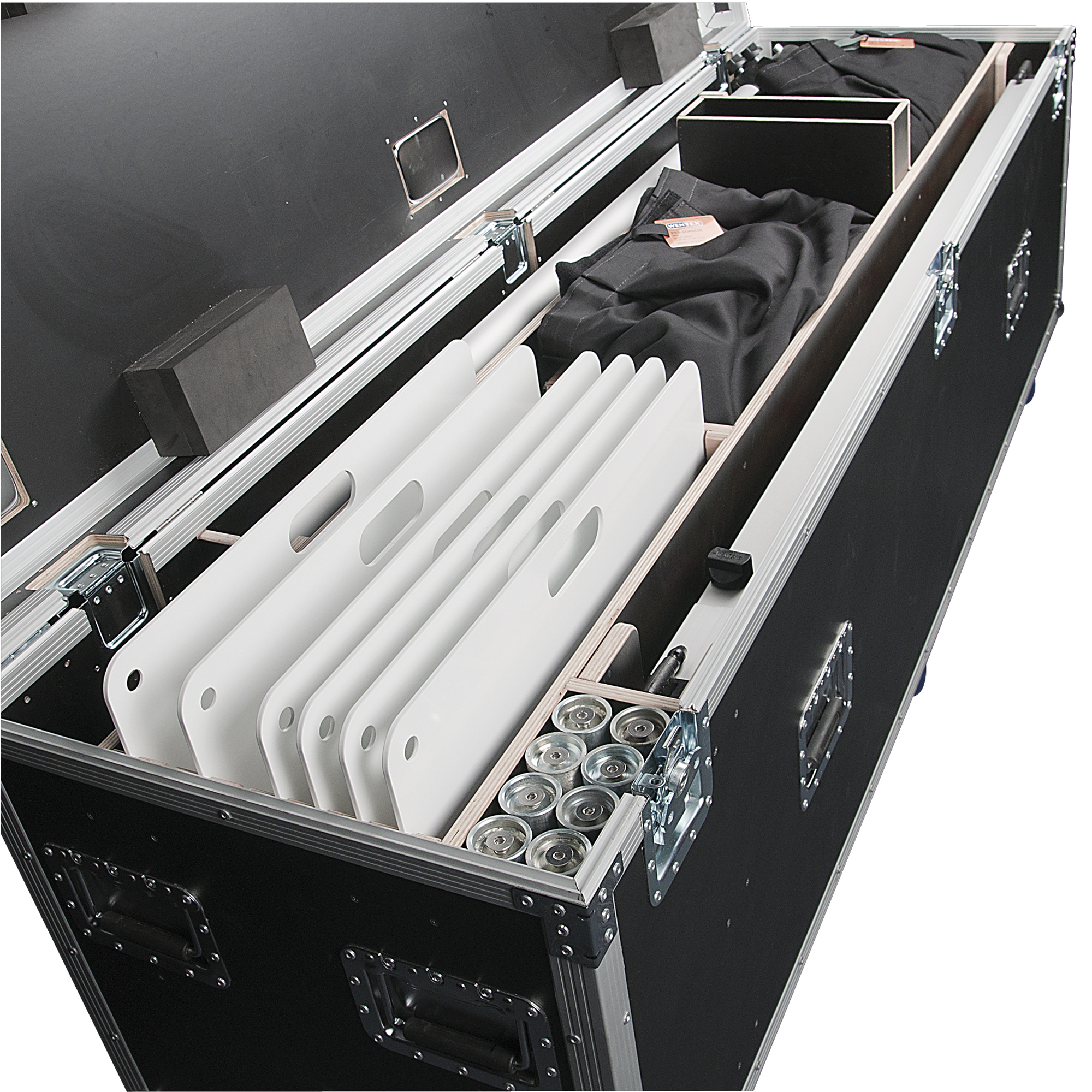 Dieses Case ist für die Aufbewahrung aller Komponenten von 8 kompletten Pipe & Drape-Sets mit 600 x 600 mm Grundplatten ausgelegt. Mit dem Inhalt eines solchen Sets können Sie bis zu 21 m abdecken: