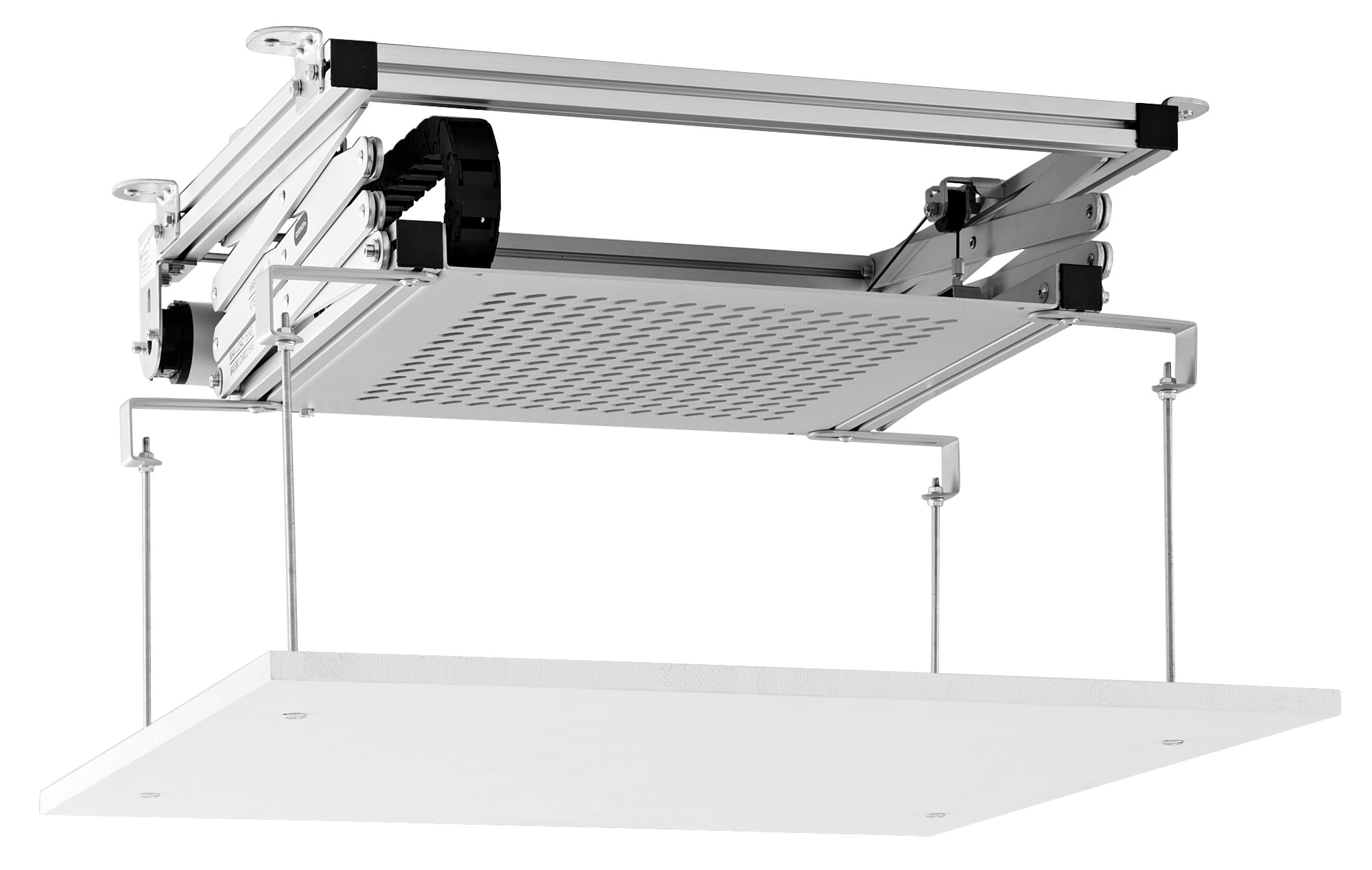 Um im eingefahrenen Zustand einen sauberen Abschluss mit der Raumdecke zu ermöglichen, kann ein Panel Ihrer abgehängten Decke höhenvariabel am Lift befestigt werden.