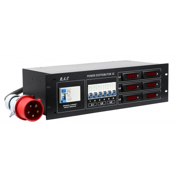 PSA-321 is a 32A power distribution with 3x 32A/400V input and 6 Schuko outputs. Each phase output (2x schuko, 16A) is additional secured with a 16A protection and can be readout via a 4-digit voltmeter and amperemeter. Additional a further FI is built-in on the front for protection from short- circuits and offset current. Two further 32A outlets for connection of additional power distributions or equipments on the rear.