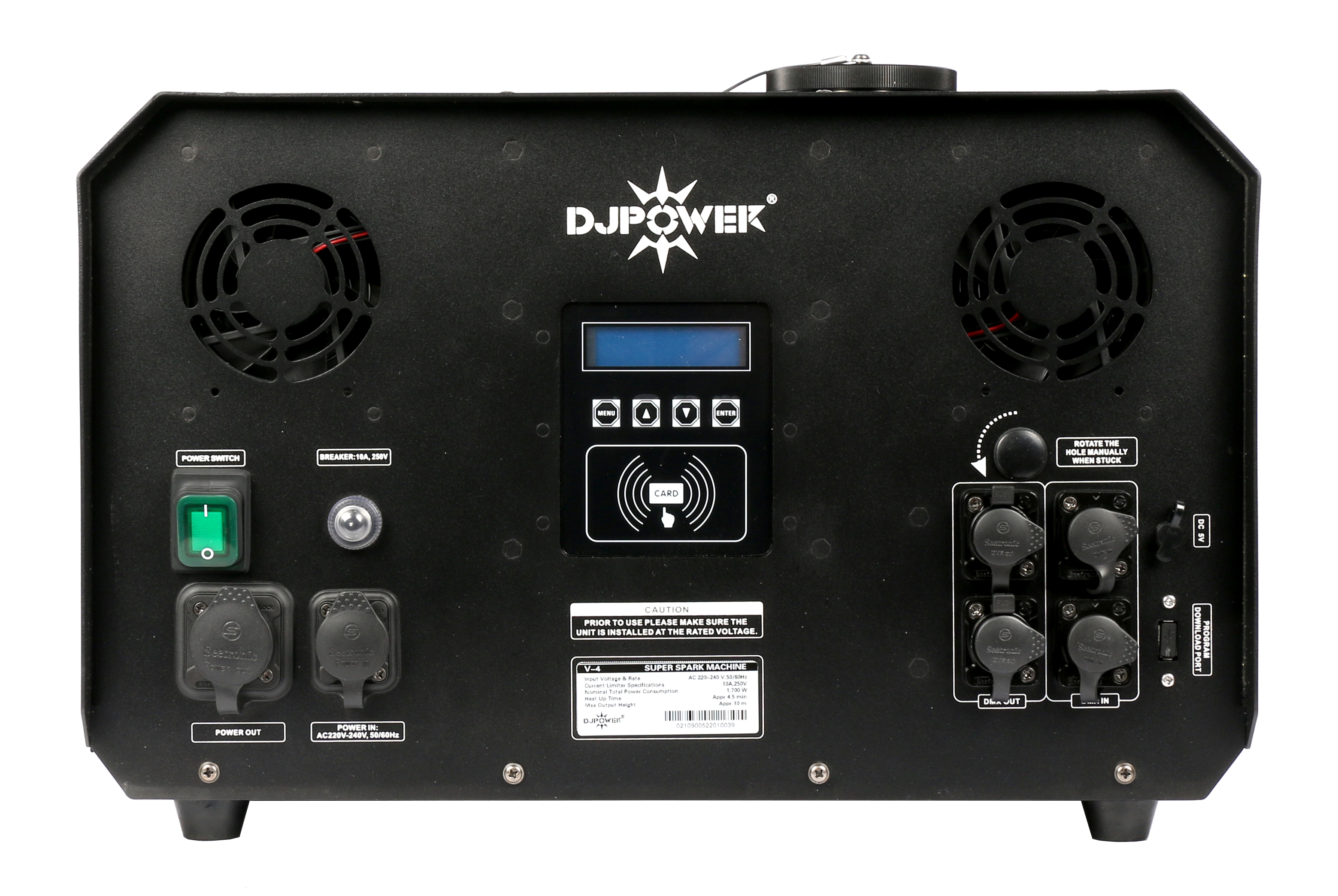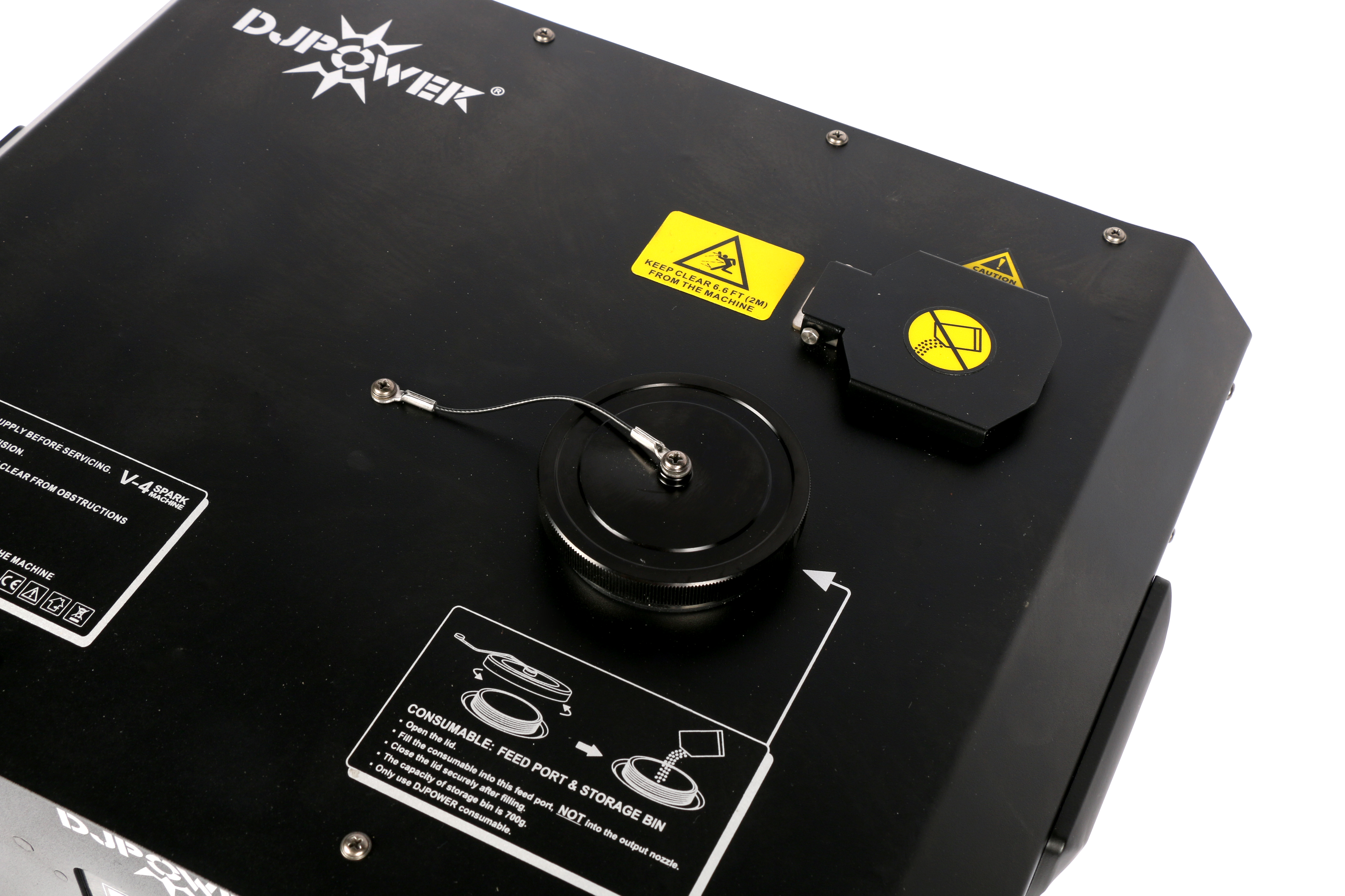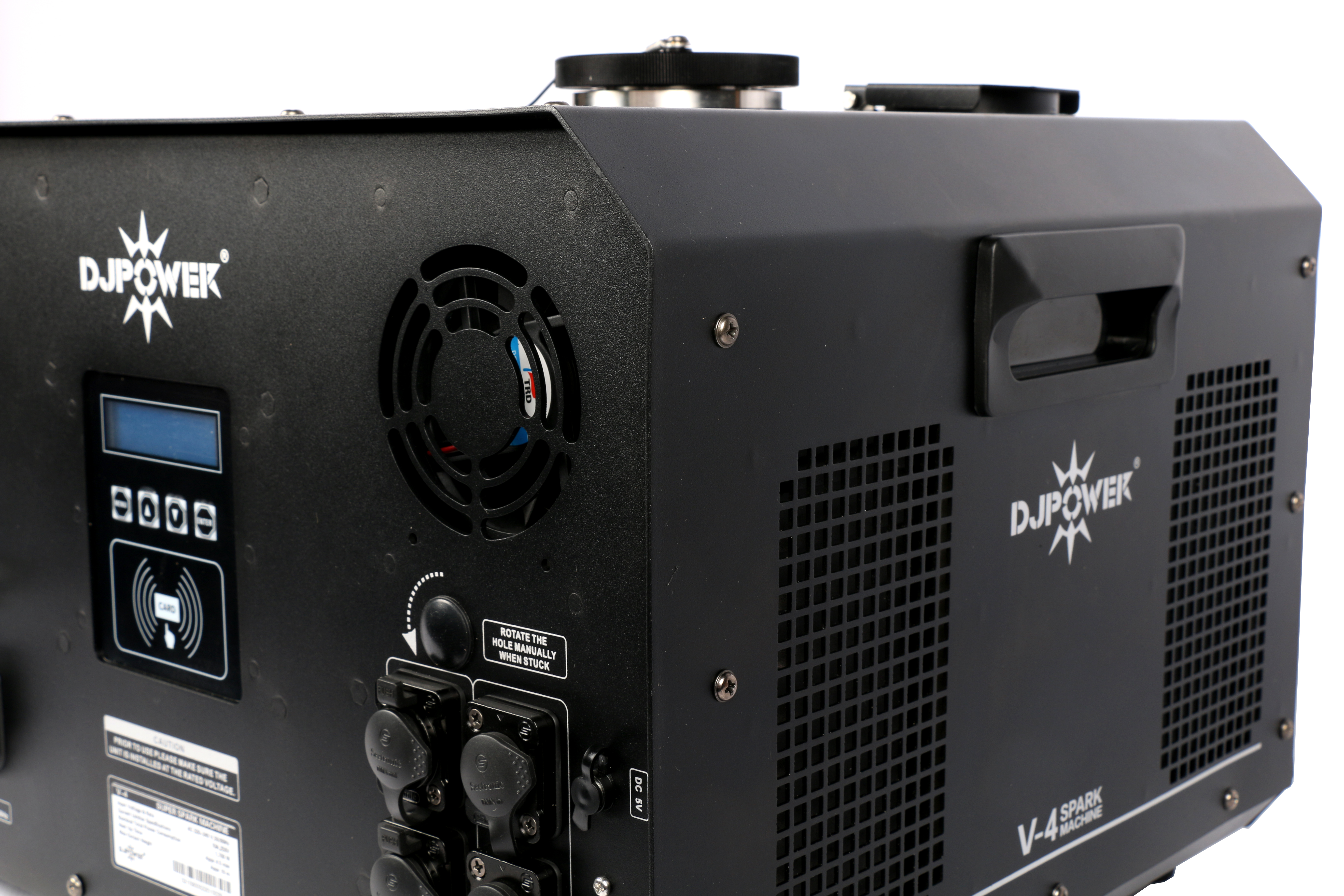 To ensure maximum safety during operation, the Spark V-4 automatically shuts off after 30 seconds of continuous ejection and can then be reactivated. In order to use the Spark V-4 you are restricted to use the DJ Power granules. It comes with a special key card that unlocks the device for use.