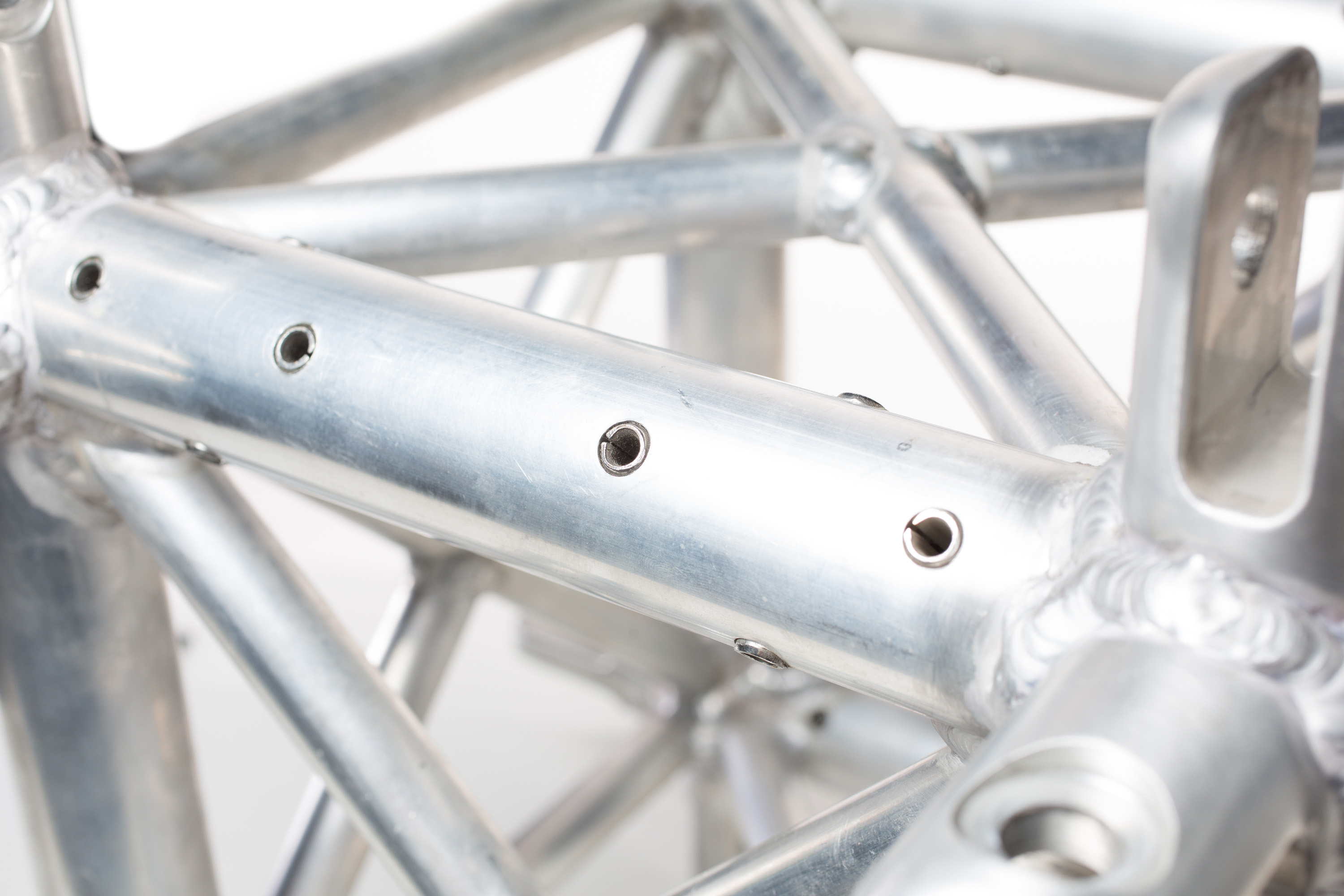 An allen M-Type-Eckelementen von Global Truss engineered by Camco sind die Gabelverbinder für die zwei horizontalen Abgänge in Richtung der Haupttragrohre eingesplintet - die Verbinder für die anderen horizontalen und vertikalen Abgänge sind angeschweißt.