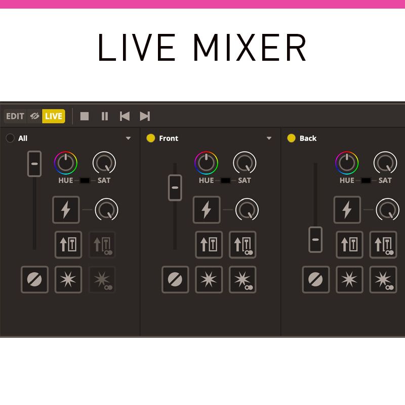 - Live Mixer: Control the dimmers of each group directly in the new Live mixer rack. Trigger the strobe, a blinder, change the colour... also from the Live mixer.