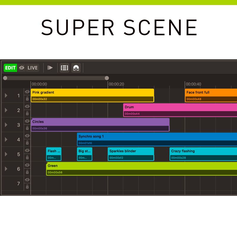 - Super Scene: Combine your different scenes on the timelines of a Super Scene and easily create complex and perfectly timed scenes with perfect precision. Change one of the source scenes and your Super Scene will be automatically updated.